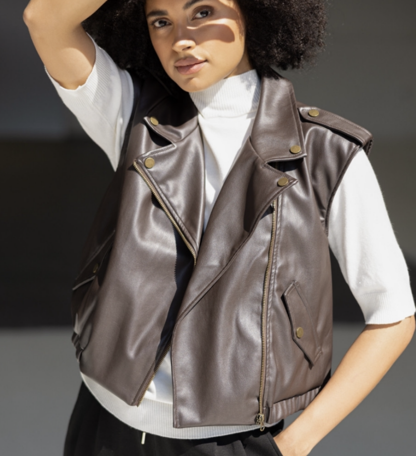 - Metal logo zipper closure at center front.